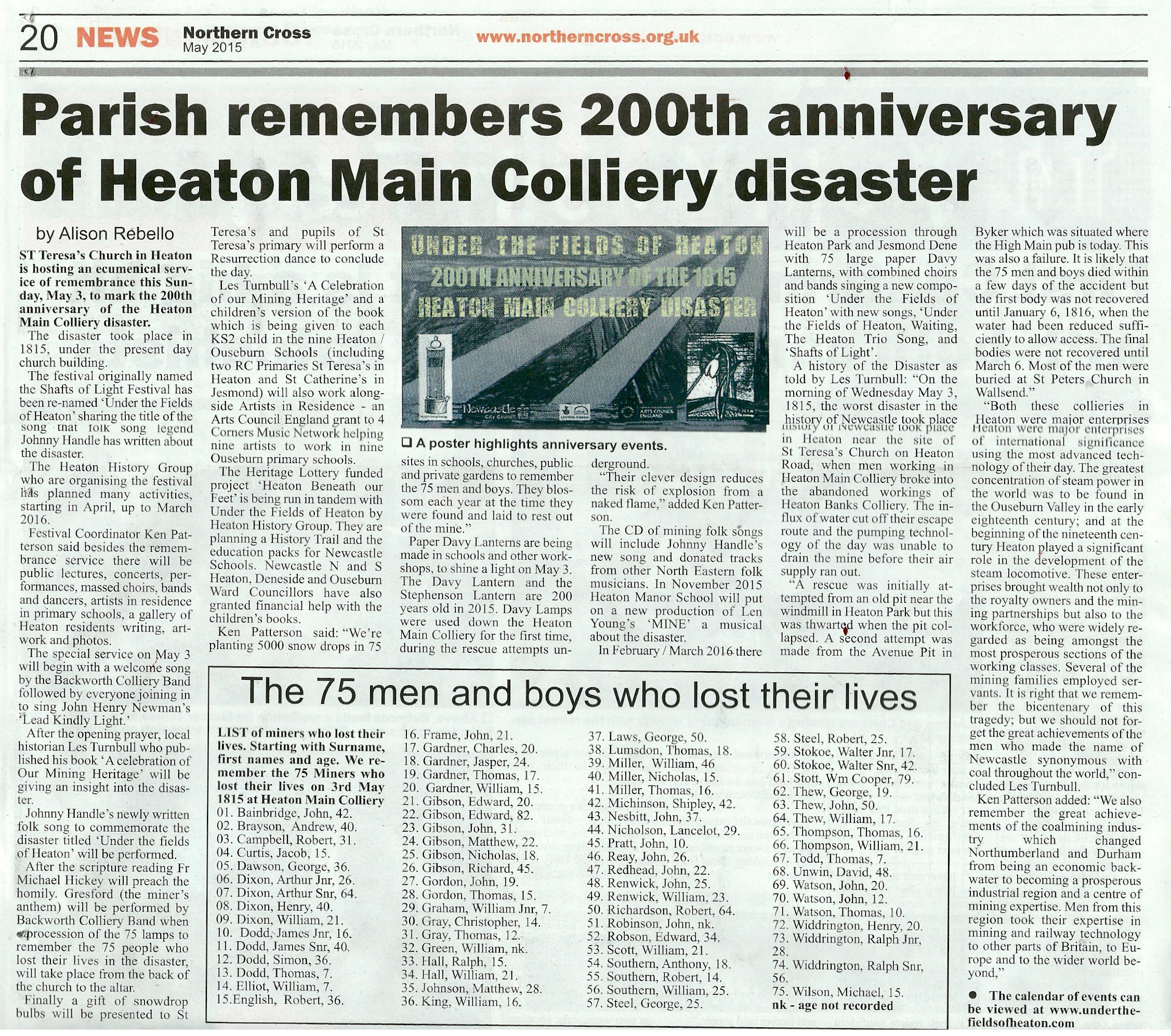 “The events will be an opportunity for people to remember the loss of life but also to mark the fact that Heaton was internationally significant in the development of mining in the 18th and 19th Centuries,” said Heaton History Group secretary Chris Jackson. “There is sadness over the disaster but also pride in Heaton’s mining past.”